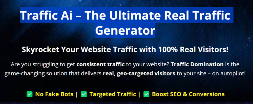 Traffic Domination is a real traffic generator tool that helps you send genuine human visitors to your website. Unlike bots or fake clicks, it mimics natural browsing behavior to ensure safe and effective traffic delivery for SEO, engagement, and conversions.